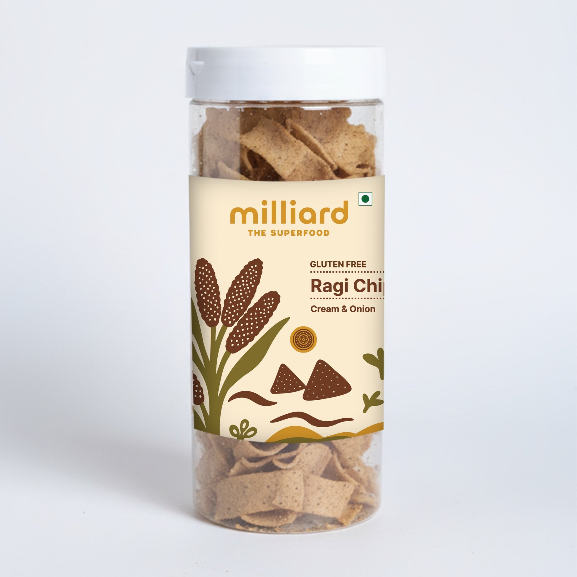 Ragi Chips – Cream & Onion: Earthy ragi flavor paired with a creamy onion twist, delivering a unique and wholesome crunch.